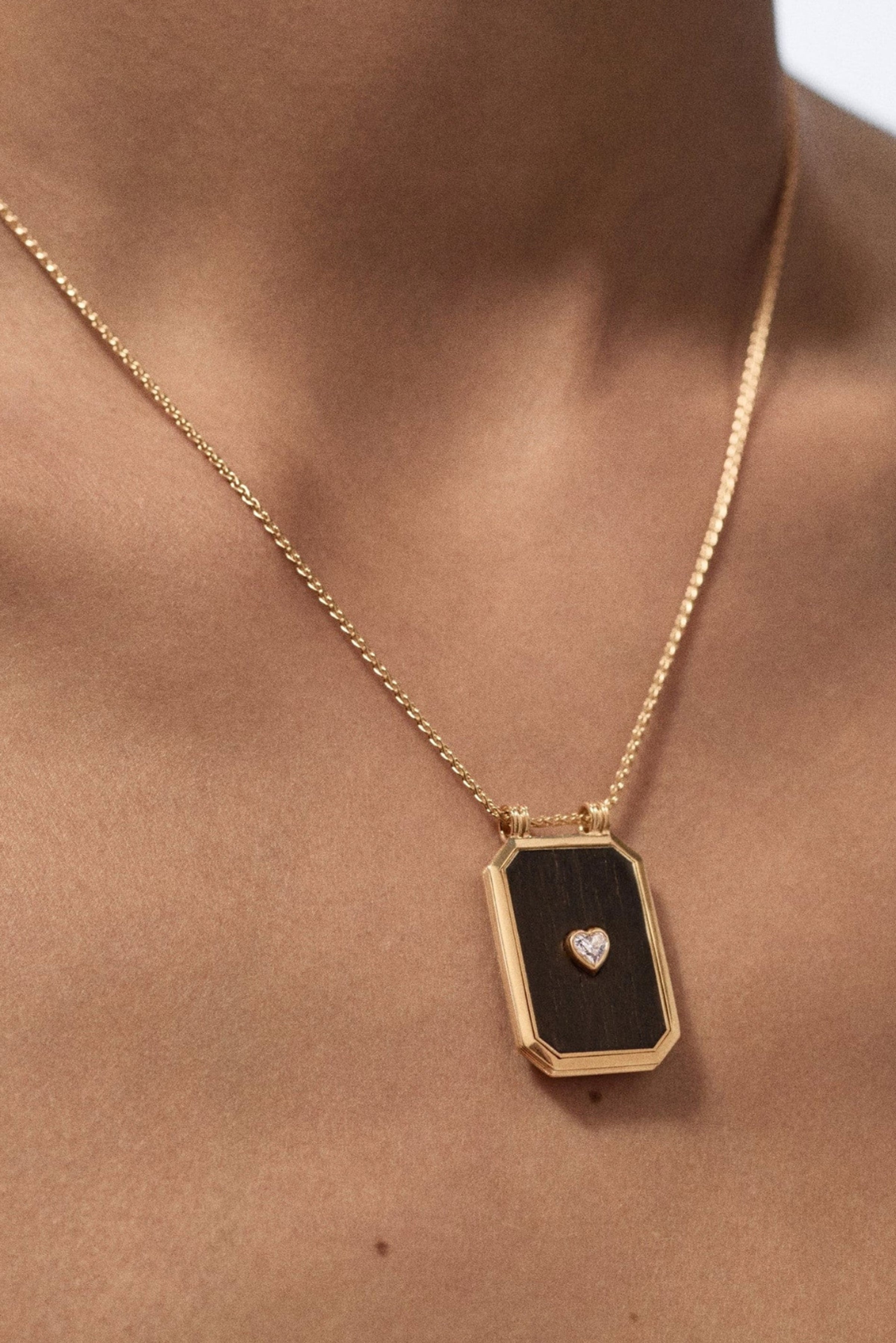 Medium yellow gold scapular, set with a heart cut white diamond, adorned with black ebony.