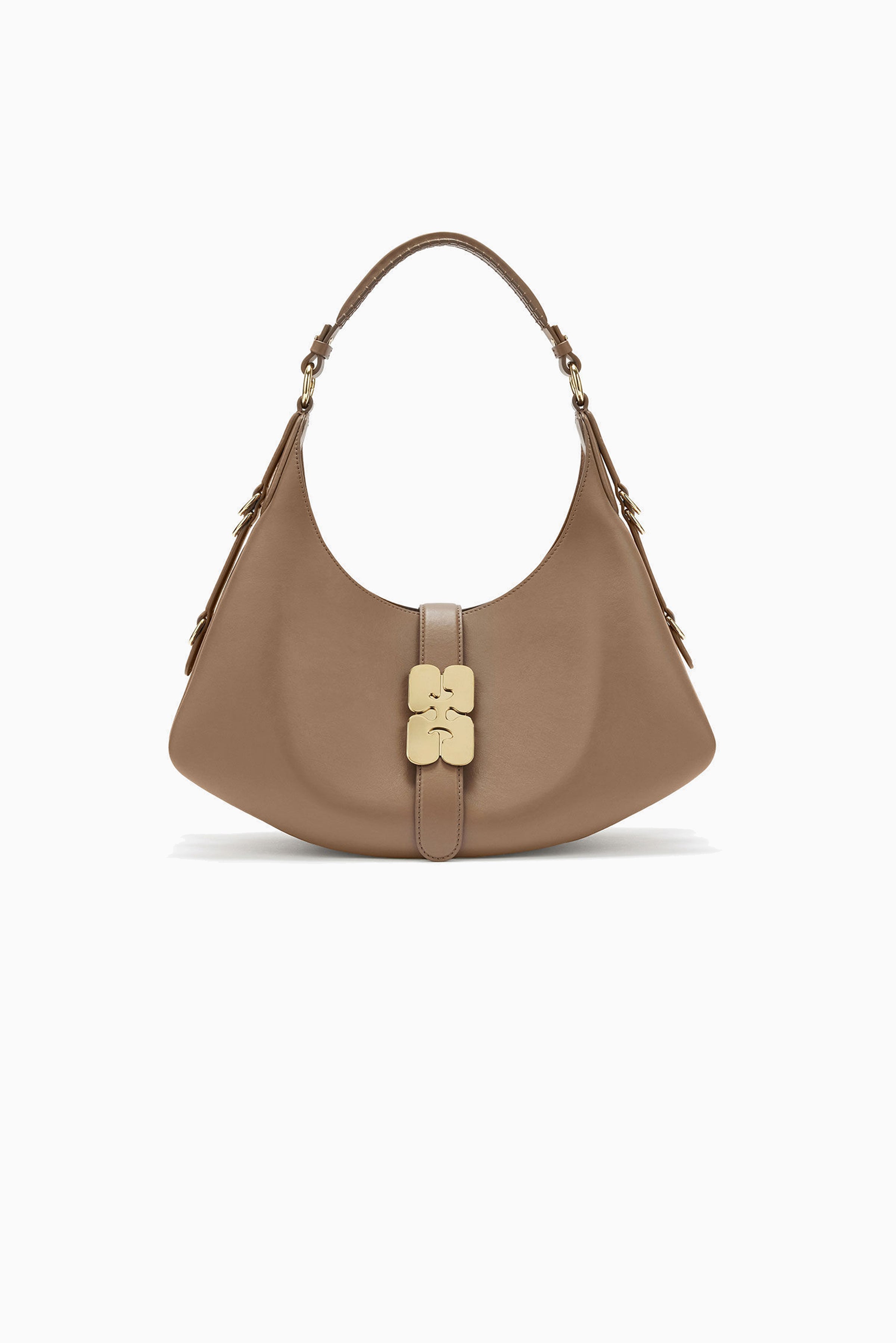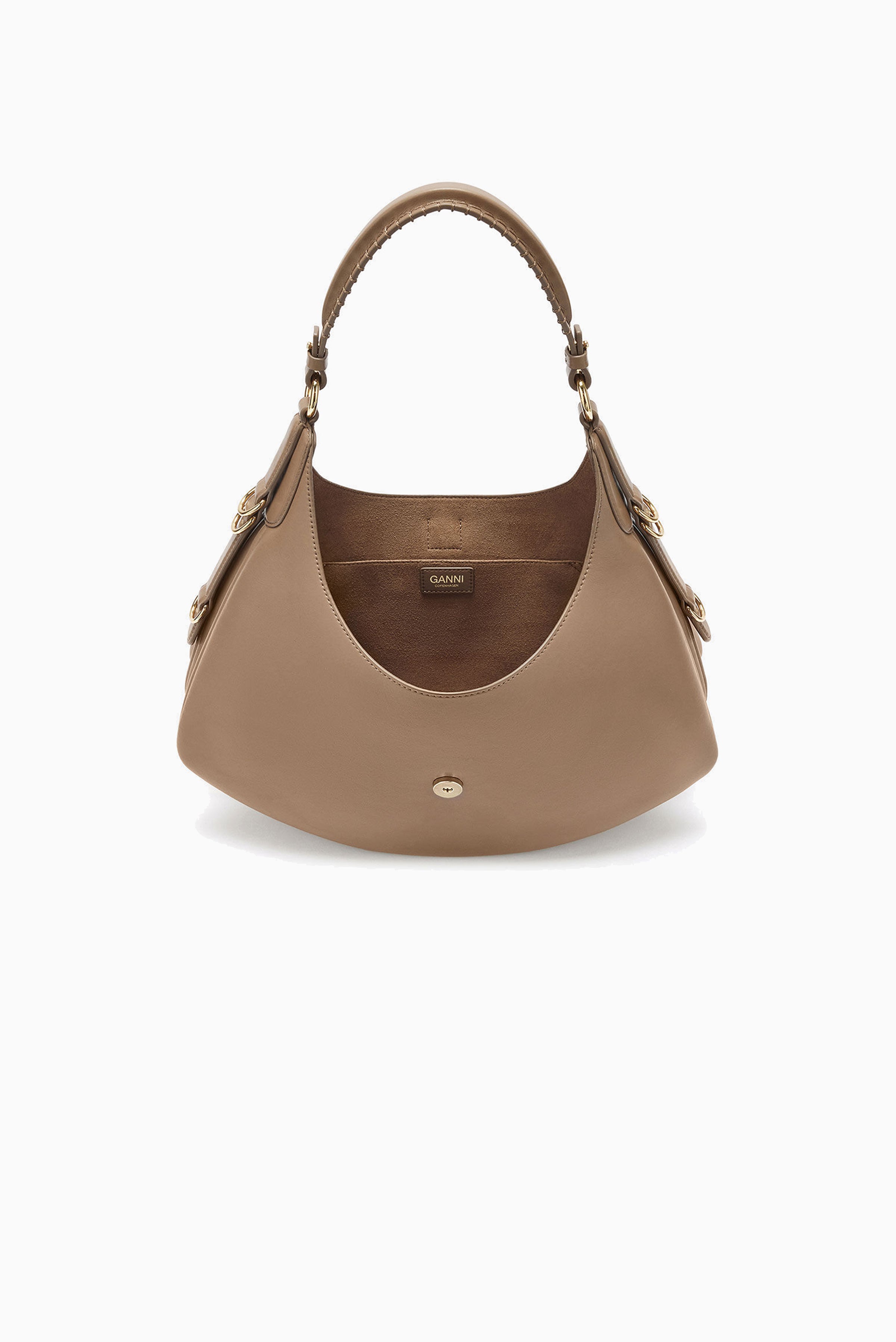 This bag features a soufflet-style silhouette, a shoulder strap and D-ring detailing at the side. The bag has a closure tab with the signature GANNI Butterfly, one main compartment and an inside open pocket
