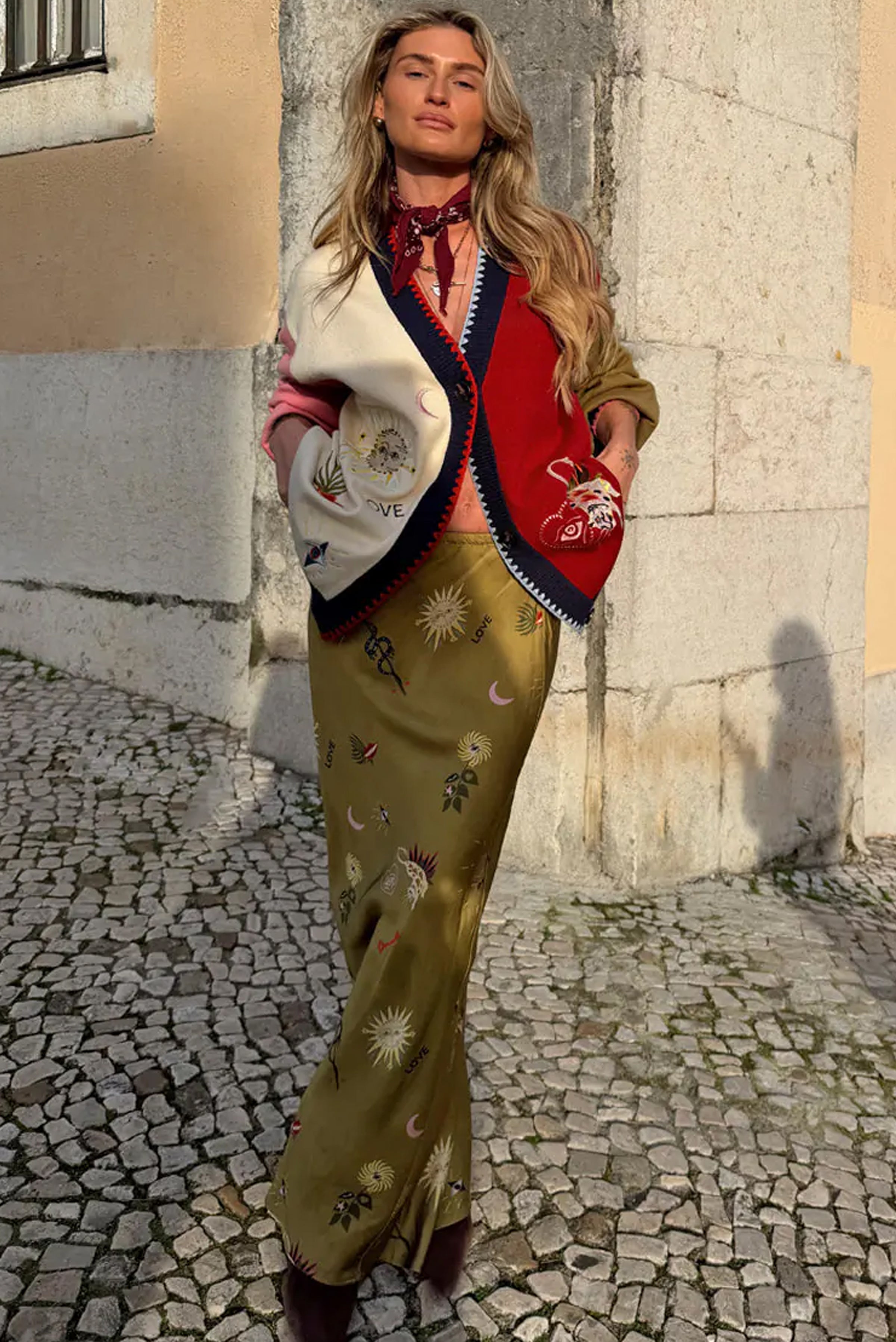 Mystical print cardi, featuring embroidered motifs on a multicoloured base. With contrast blanket stitching on the hems adding an additional touch of texture, it's the perfect feel good throw on!