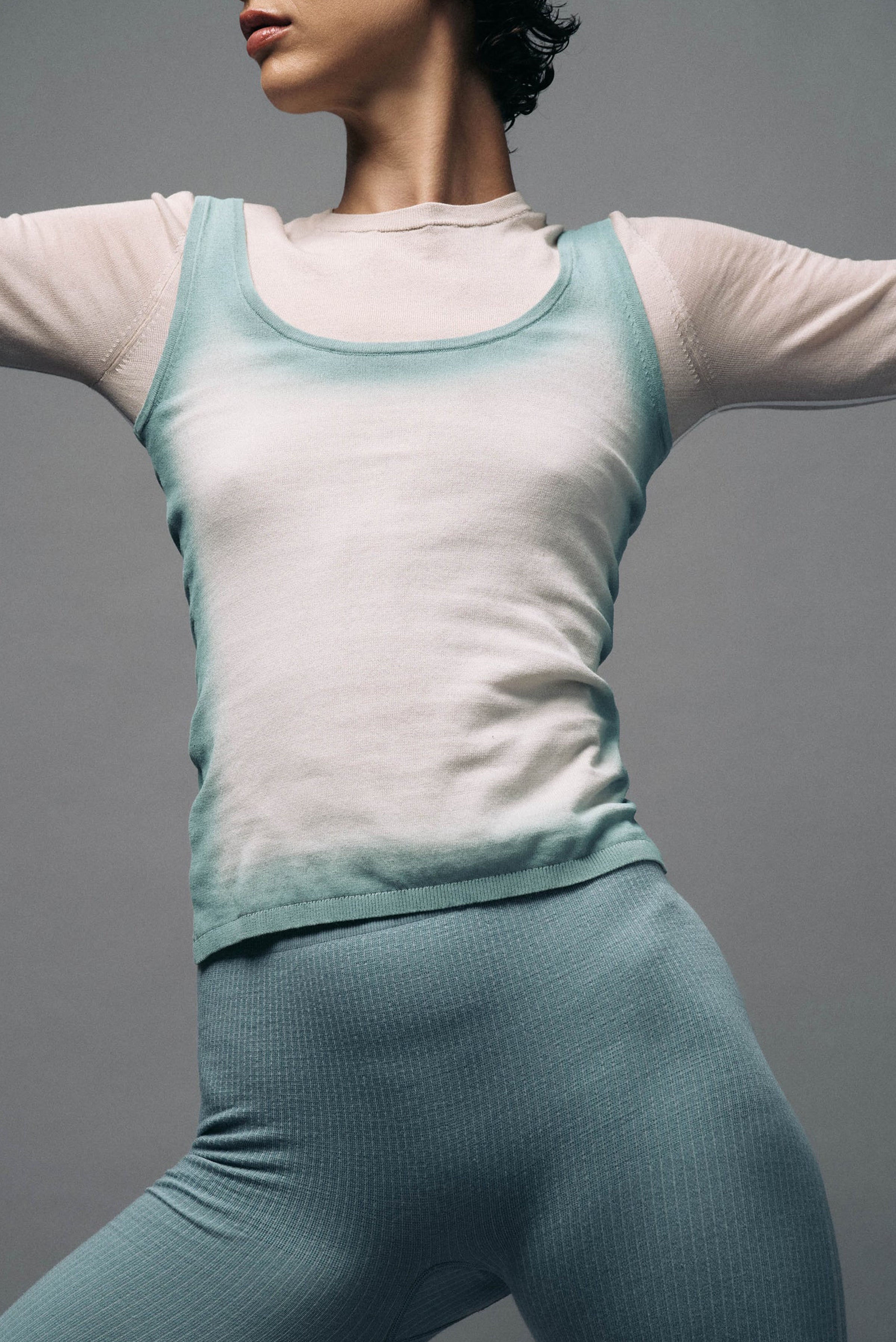 Slim fit high-neck tank crafted from light to mid-weight knit fabric, offering a comfortable and breathable feel. Made using fully-fashioned knitwear techniques for a precise fit and high-quality finish, featuring a gradient print all around. Constructed with organic cotton, ensuring sustainability and eco-friendly production practices.