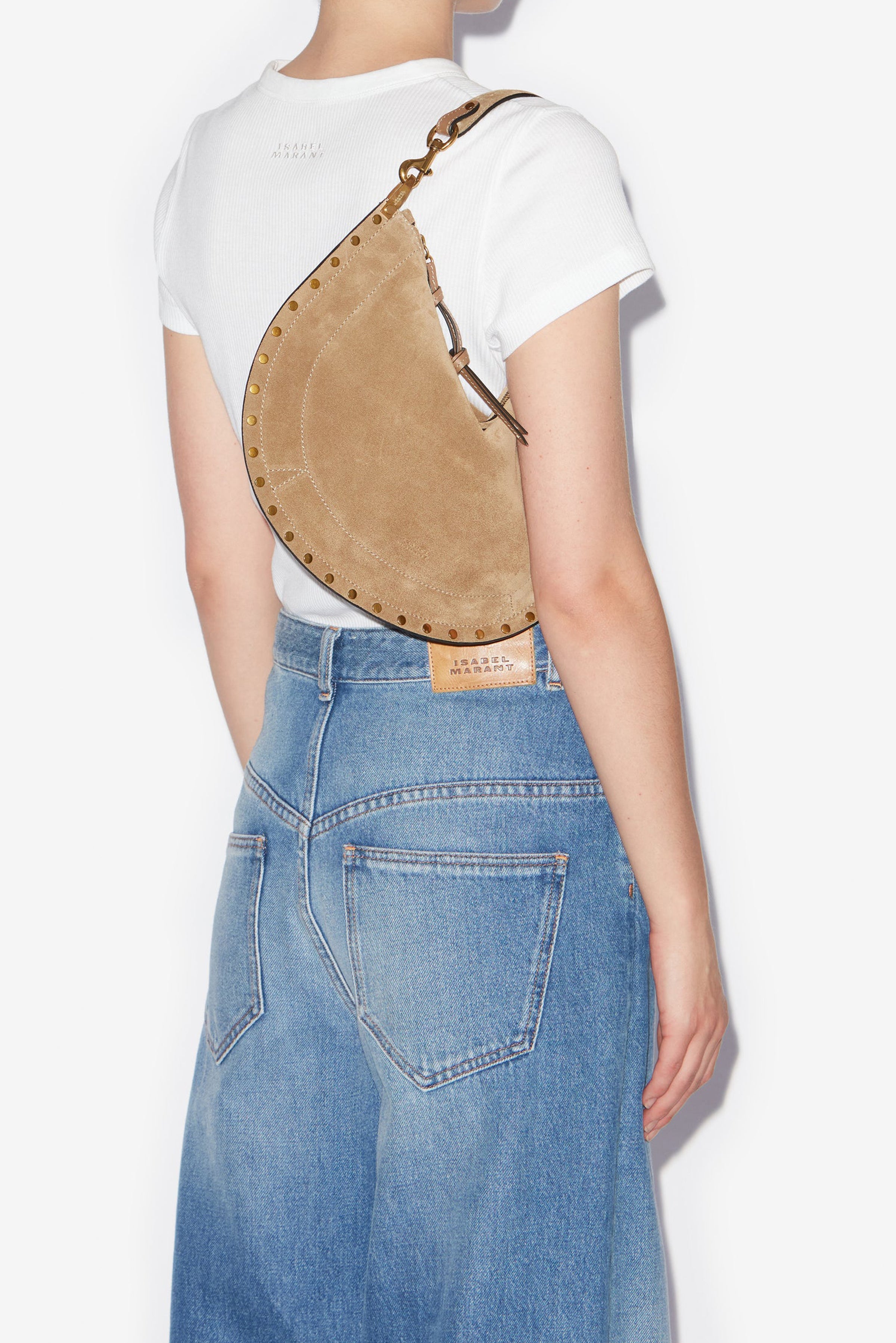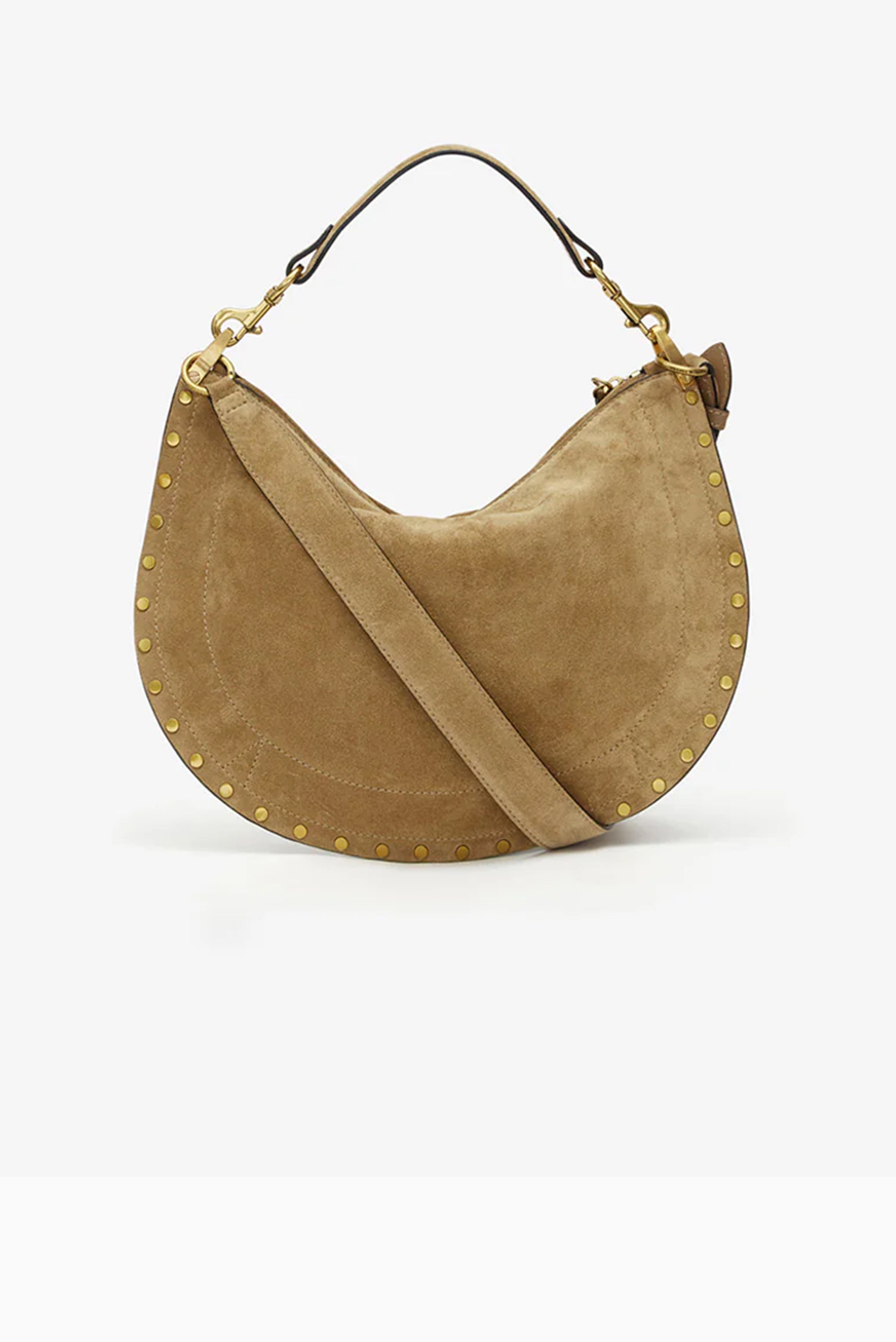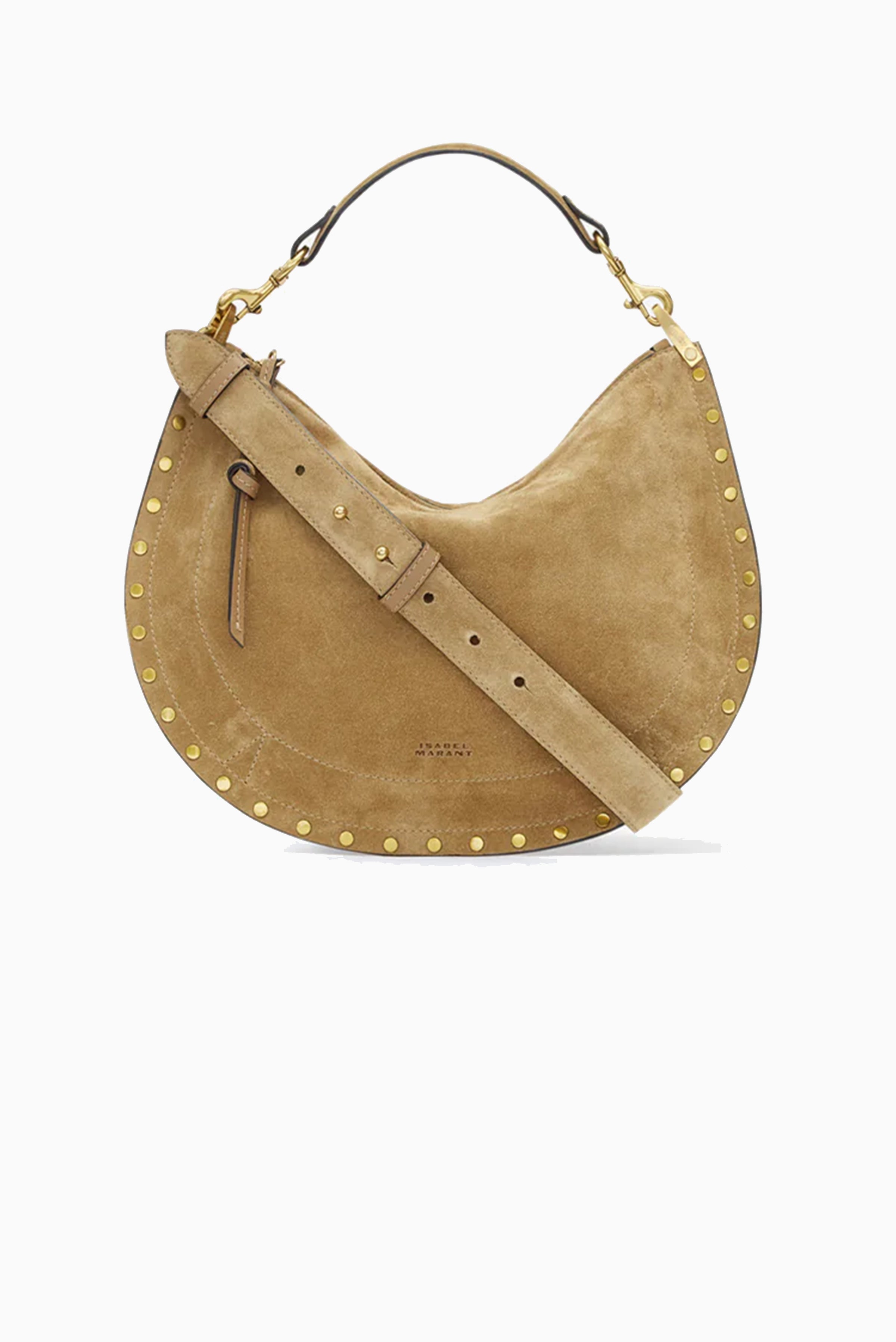 Oskan Soft Zip Shoulder Strap Bag in luxurious suede calfskin leather. Versatile carry options include hand, shoulder, or crossbody styling with a removable 34 cm handle. Features adjustable studded shoulder strap, braided leather trim, dual zippers with leather sliders, and signature Isabel Marant branding. Gold-finish hardware and twill lining complete this refined piece.