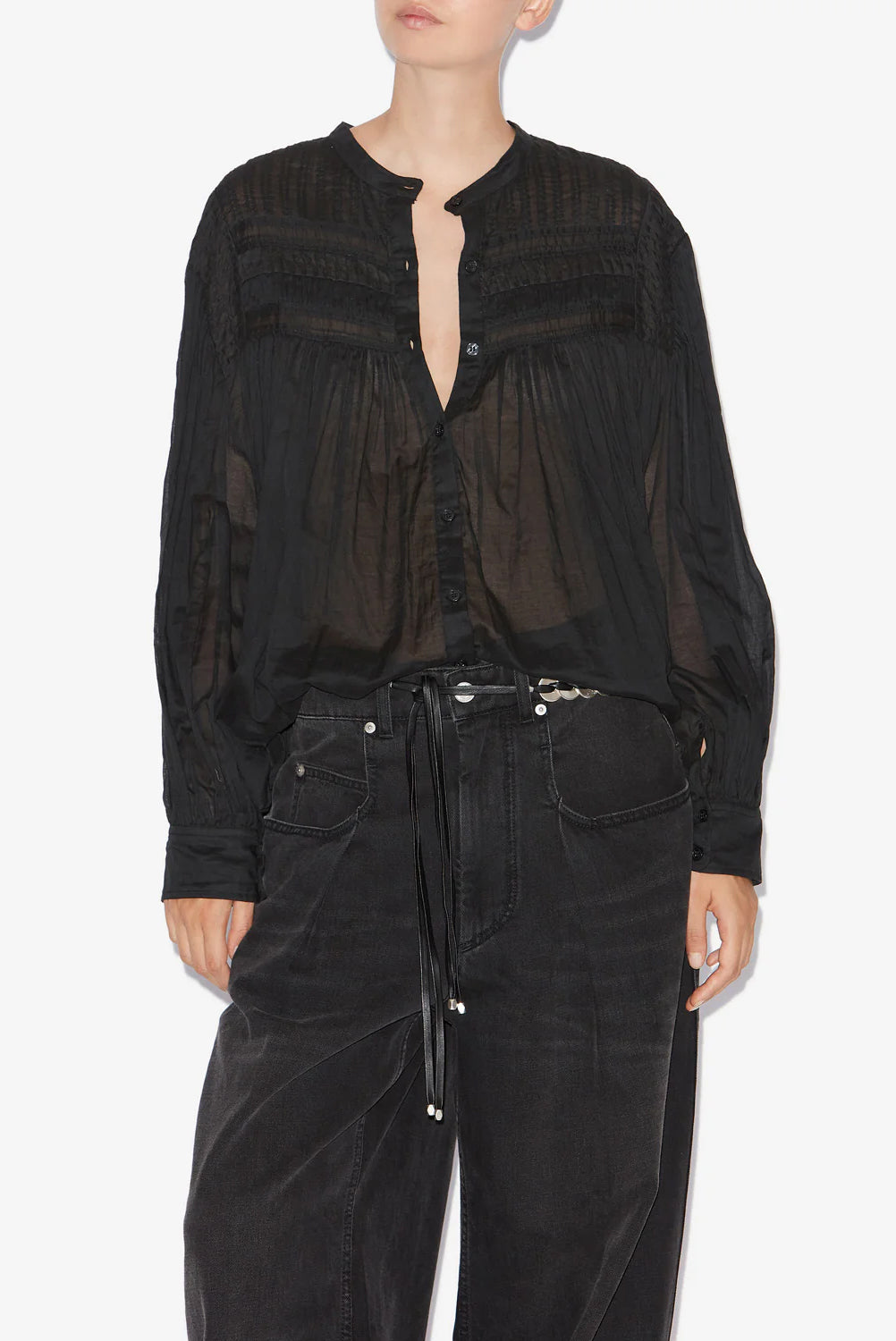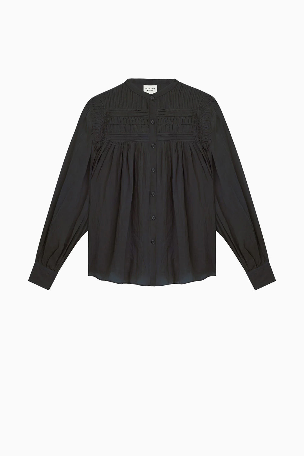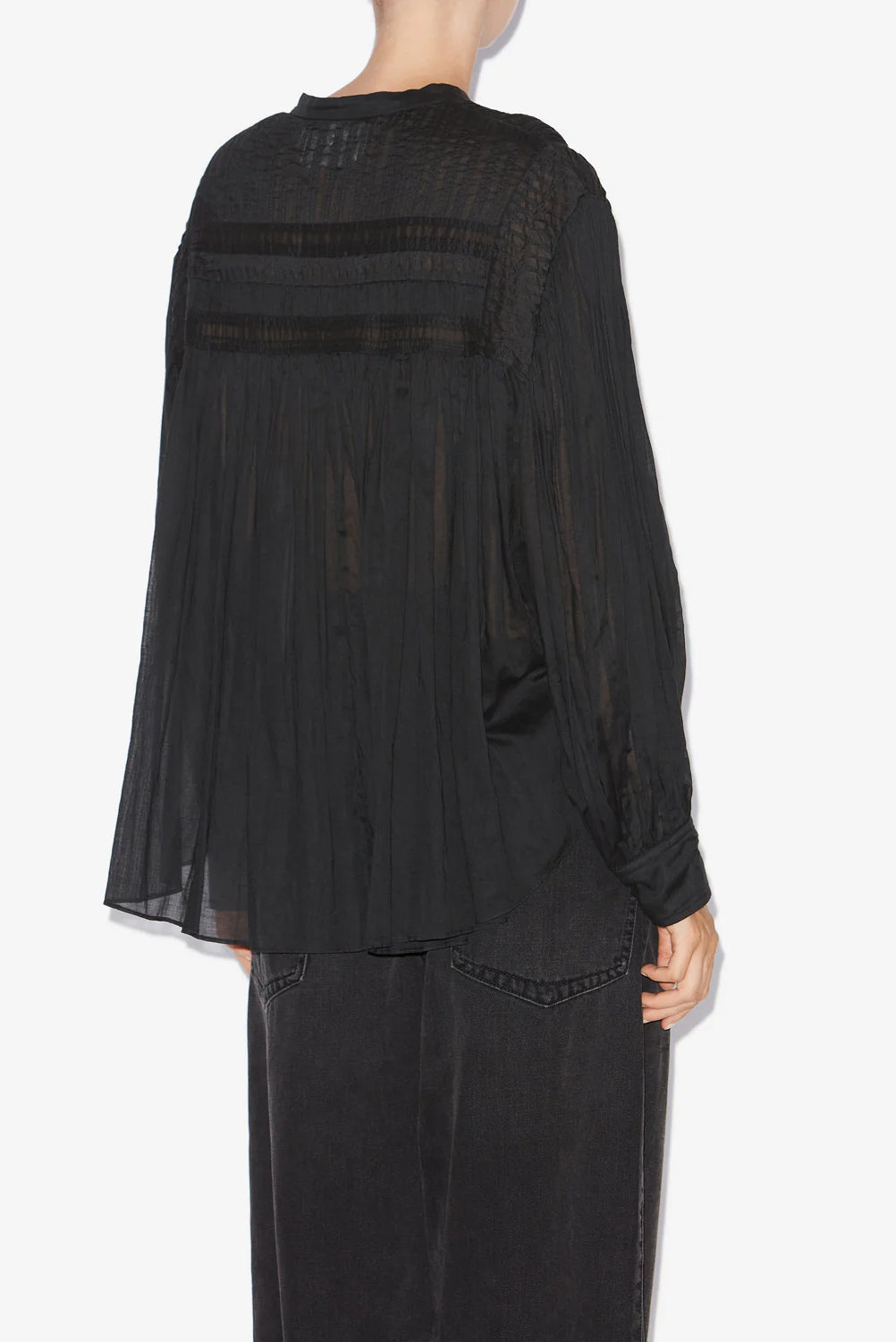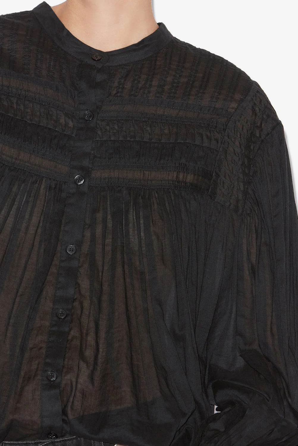 Gathered cotton voile blouse with round neckline, pleated yoke, long sleeves, and buttoned front. Loose fit with rounded hem.