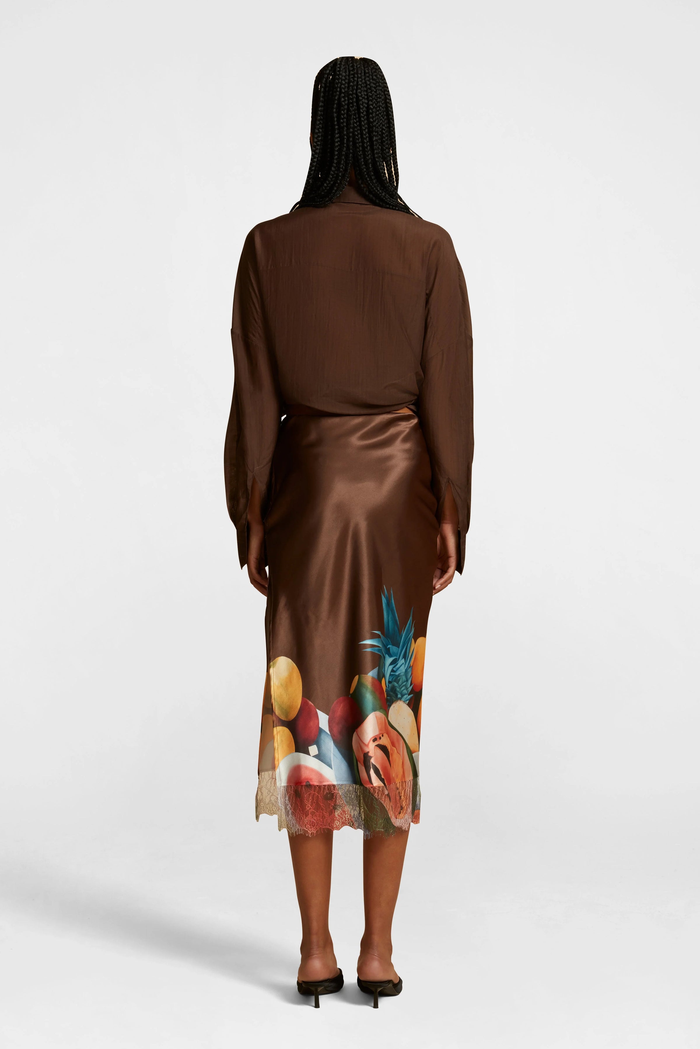 Silk satin skirt with print by Colombian artist Ana Mercedes Hoyos.
