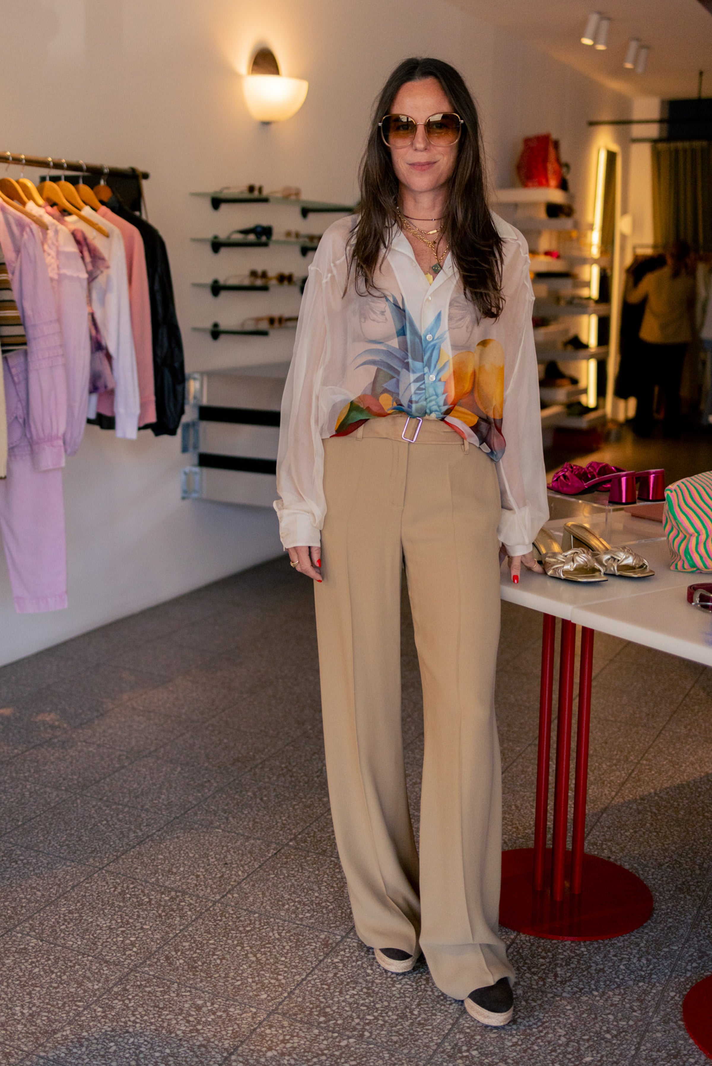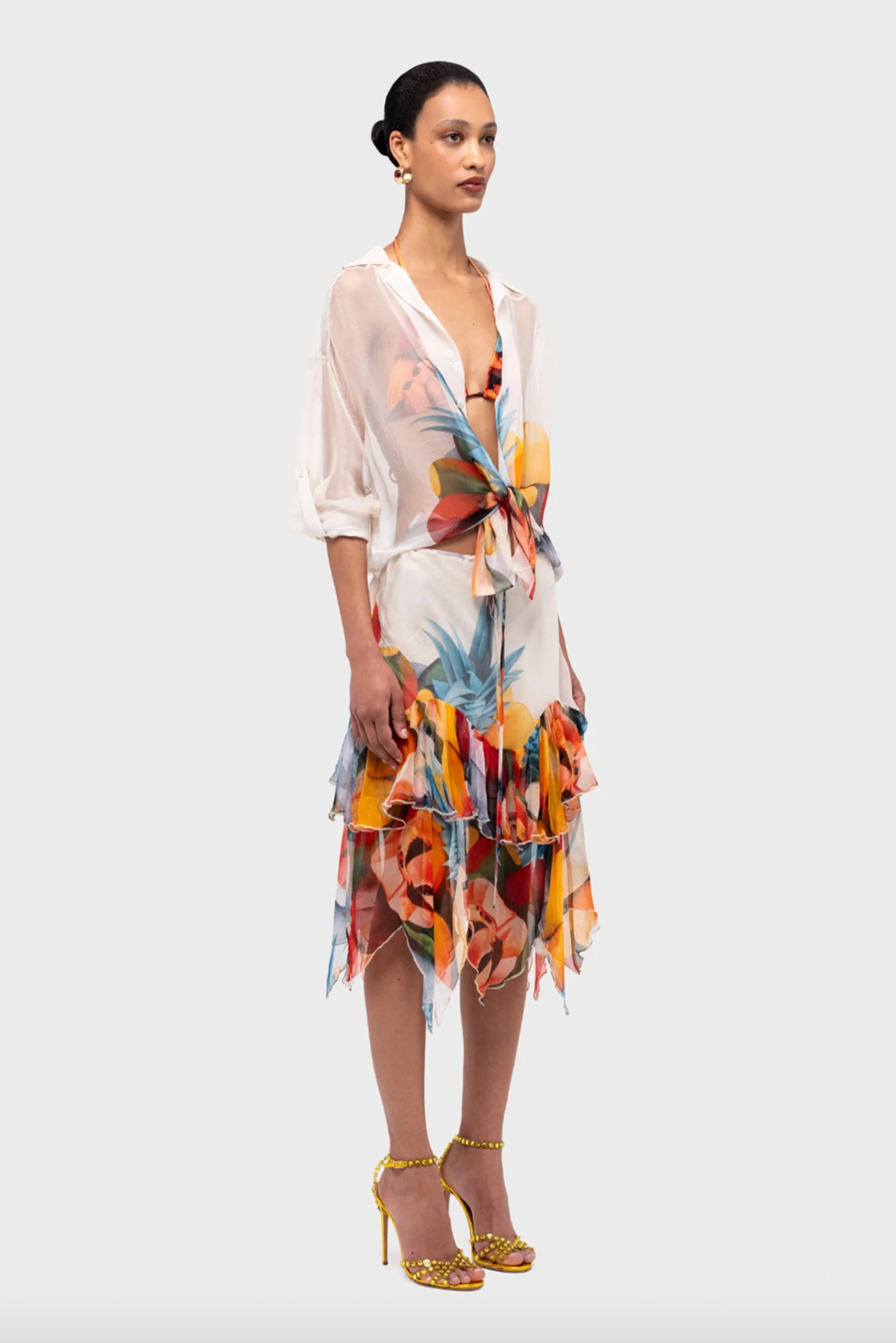 Light as air and effortlessly elegant, this sheer silk chiffon shirt features a vibrant print by Colombian artist Ana Mercedes Hoyos. Its fluid silhouette and translucent finish capture the warmth and movement of tropical light, while the vivid fruit-inspired artwork celebrates Colombian creativity. Ideal for layering over swimwear or styling open with the matching Salpicón Skirt, it transitions seamlessly from sun-drenched afternoons to breezy evenings.