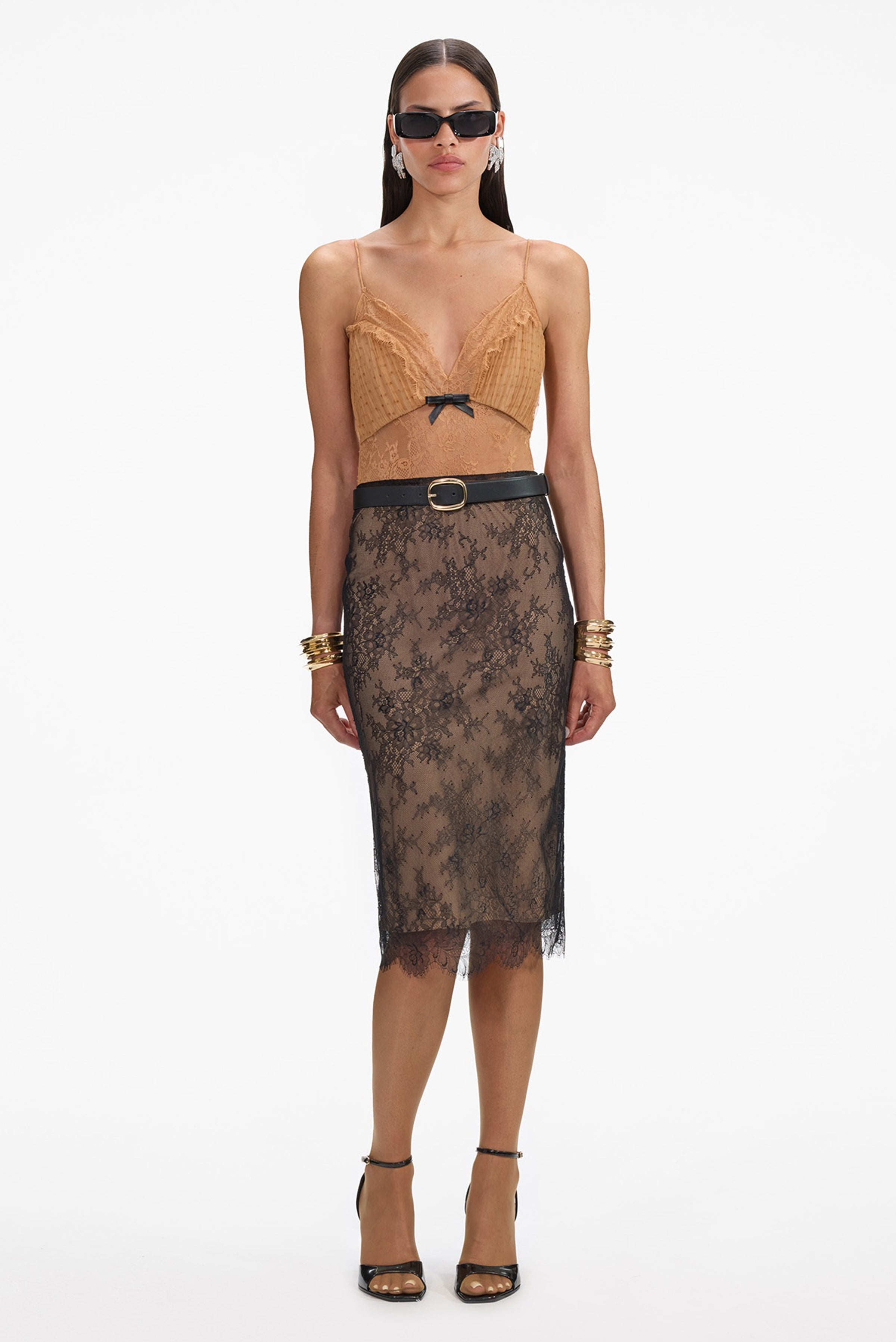 Elegant lace midi skirt featuring an integrated nude slip for seamless layering. The refined construction ensures comfort and modesty while maintaining a sophisticated silhouette. Perfect for elevated occasions or polished everyday wear.