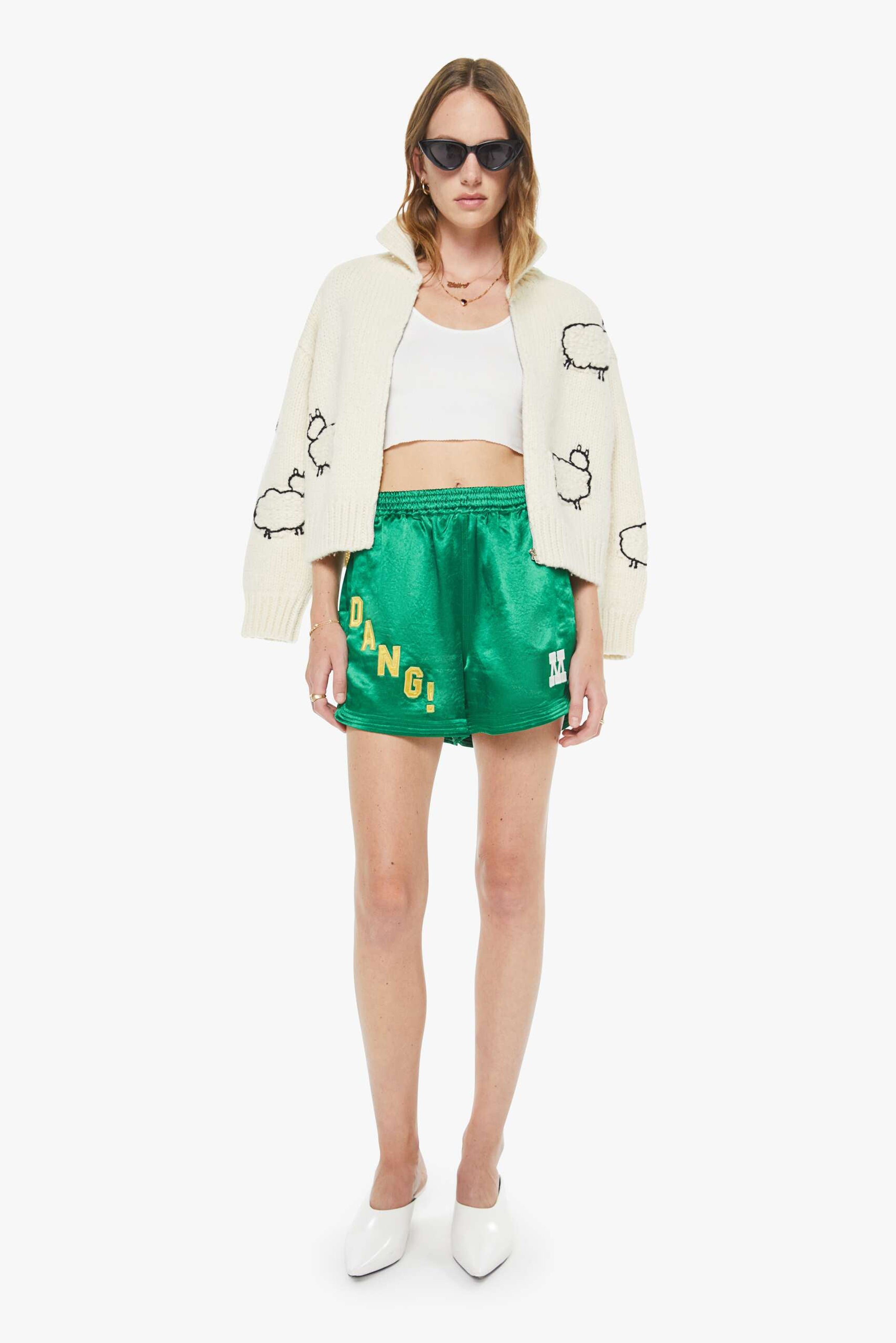Team MOTHER. Athletic-inspired shorts with a high rise, elastic waistband, slit pockets and a curved hem. Made from silky green fabric, The Star Player in Teamwork features golden-yellow letters and an M in white patched on the front.