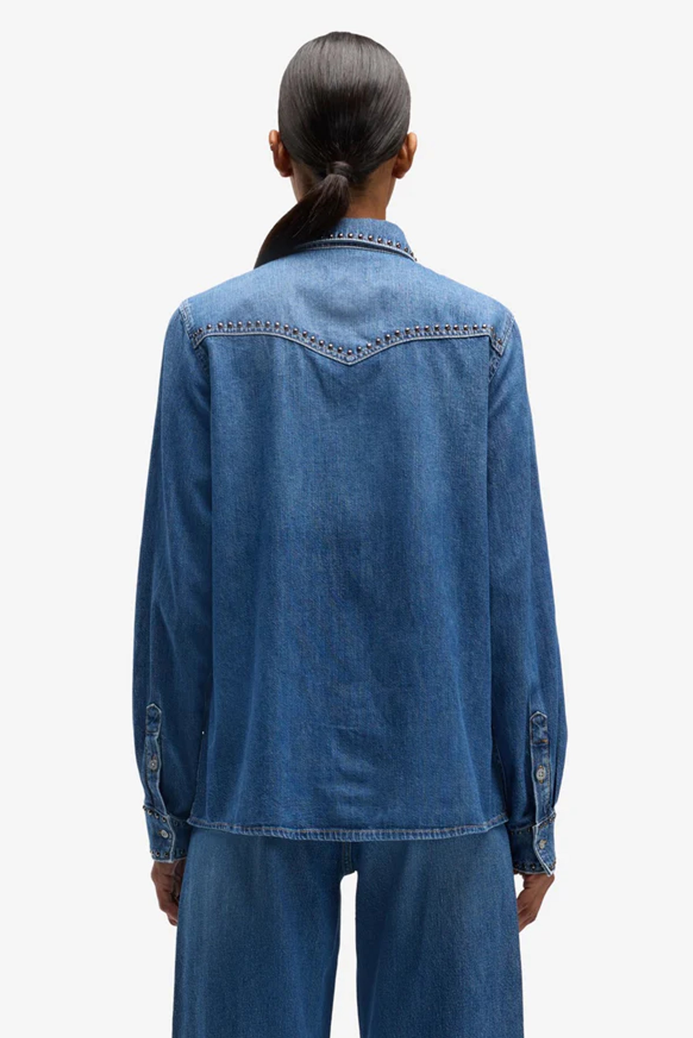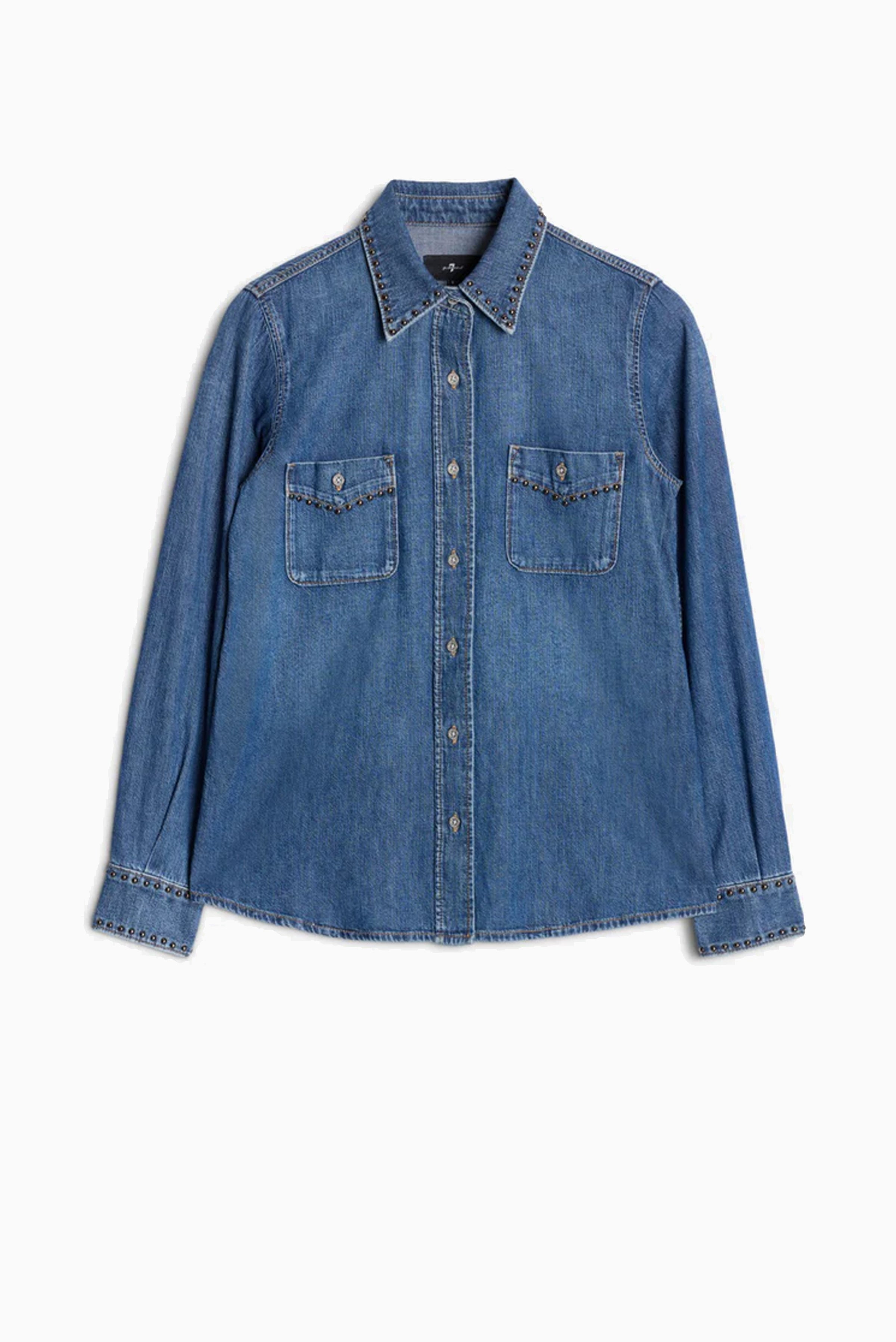 Medium wash western shirt with studded collar and chest pockets. Features easy stretch fabric for all-day comfort, front button closure, and button cuffs. Subtle western yoke adds contemporary edge while maintaining a relaxed, structured fit.